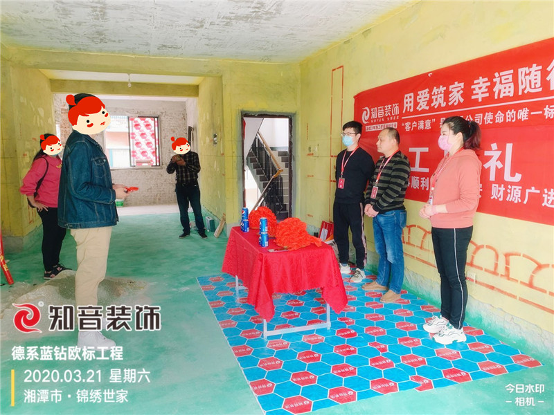 开工典礼:经过原屋验收,电梯公共过道保护,铲除墙皮,黄墙绿地保护,全房放线定位,全房放样安全防护、安全文明标牌悬挂、窗贴、门贴、燃气表电表箱保护、消防器材布置,以上各项工作完毕,举行仪式,标志正式进入施工阶段。 同时以表祝贺,也表示感谢各位业主选择我们知音,知音将会用爱筑起每一个家!