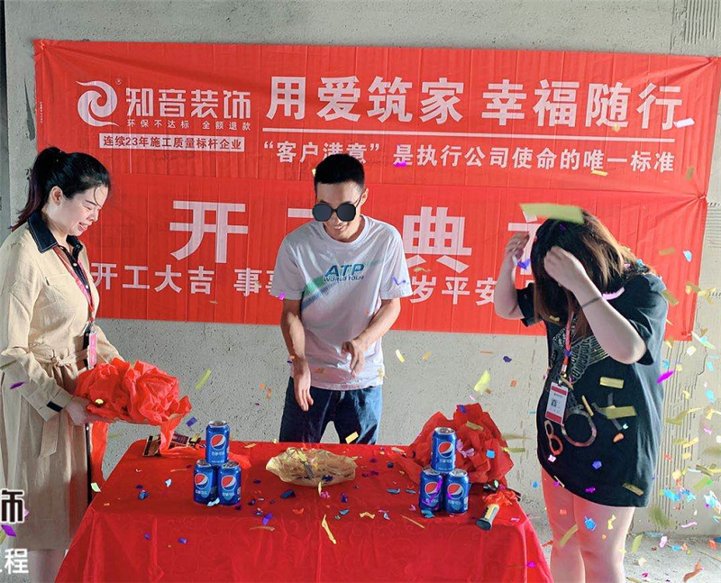 开工典礼:开工典礼:经过原屋验收,电梯公共过道保护,铲除墙皮,黄墙绿地保护,全房放线定位,全房放样安全防护、安全文明标牌悬挂、窗贴、门贴、燃气表电表箱保护、消防器材布置,以上各项工作完毕,举行仪式,标志正式进入施工阶段。 同时以表祝贺,也表示感谢各位业主选择我们知音,知音将会用爱筑起每一个家!