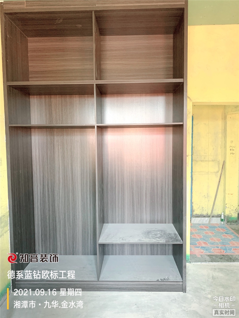 2、柜内铺贴饰面板时,先进行清洁、打磨后以白乳胶粘贴,再用少许蚊钉固定。接缝应均匀、整齐,柜类所有木作的固定,连接必须使用白乳胶再钉钉子固定。