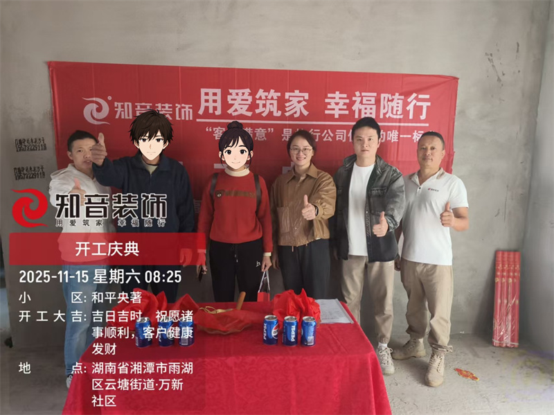 经过原屋俭收,电梯公共过道保护,铲除墙皮,全房放线定位后知音装饰为每户业主举行隆重的开工仪式以表庆贺
