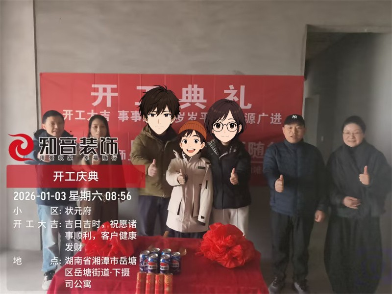 经过原屋俭收,电梯公共过道保护,铲除墙皮,全房放线定位后知音装饰为每户业主举行隆重的开工仪式以表庆贺
