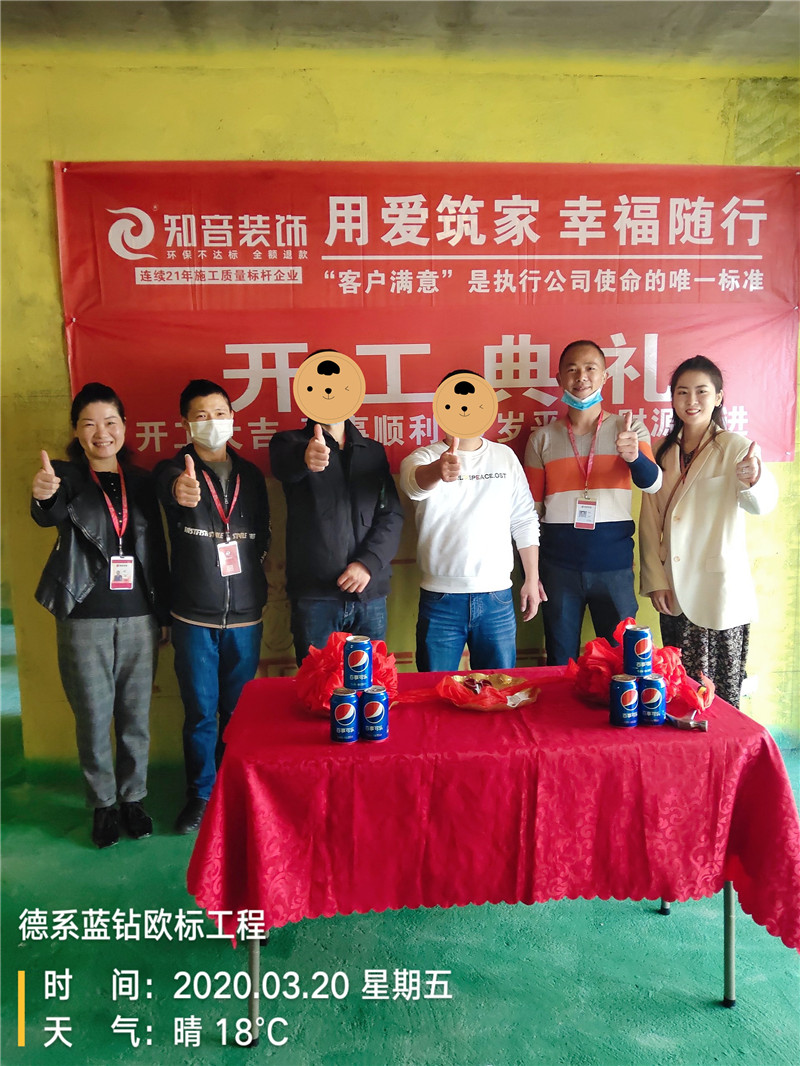 开工典礼:经过原屋验收,电梯公共过道保护,铲除墙皮,黄墙绿地保护,全房放线定位,全房放样安全防护、安全文明标牌悬挂、窗贴、门贴、燃气表电表箱保护、消防器材布置,以上各项工作完毕,举行仪式,标志正式进入施工阶段。 同时以表祝贺,也表示感谢各位业主选择我们知音,知音将会用爱筑起每一个家!