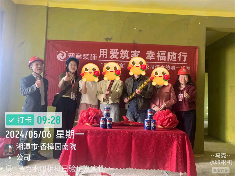 经过原屋俭收,电梯公共过道保护,铲除墙皮,全房放线定位后知音装饰为每户业主举行隆重的开工仪式以表庆贺
