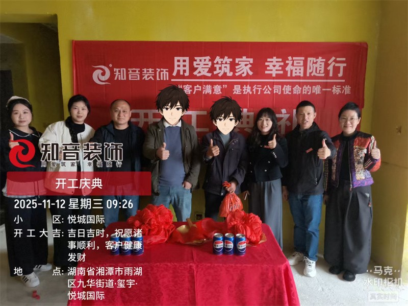 经过原屋俭收,电梯公共过道保护,铲除墙皮,全房放线定位后知音装饰为每户业主举行隆重的开工仪式以表庆贺